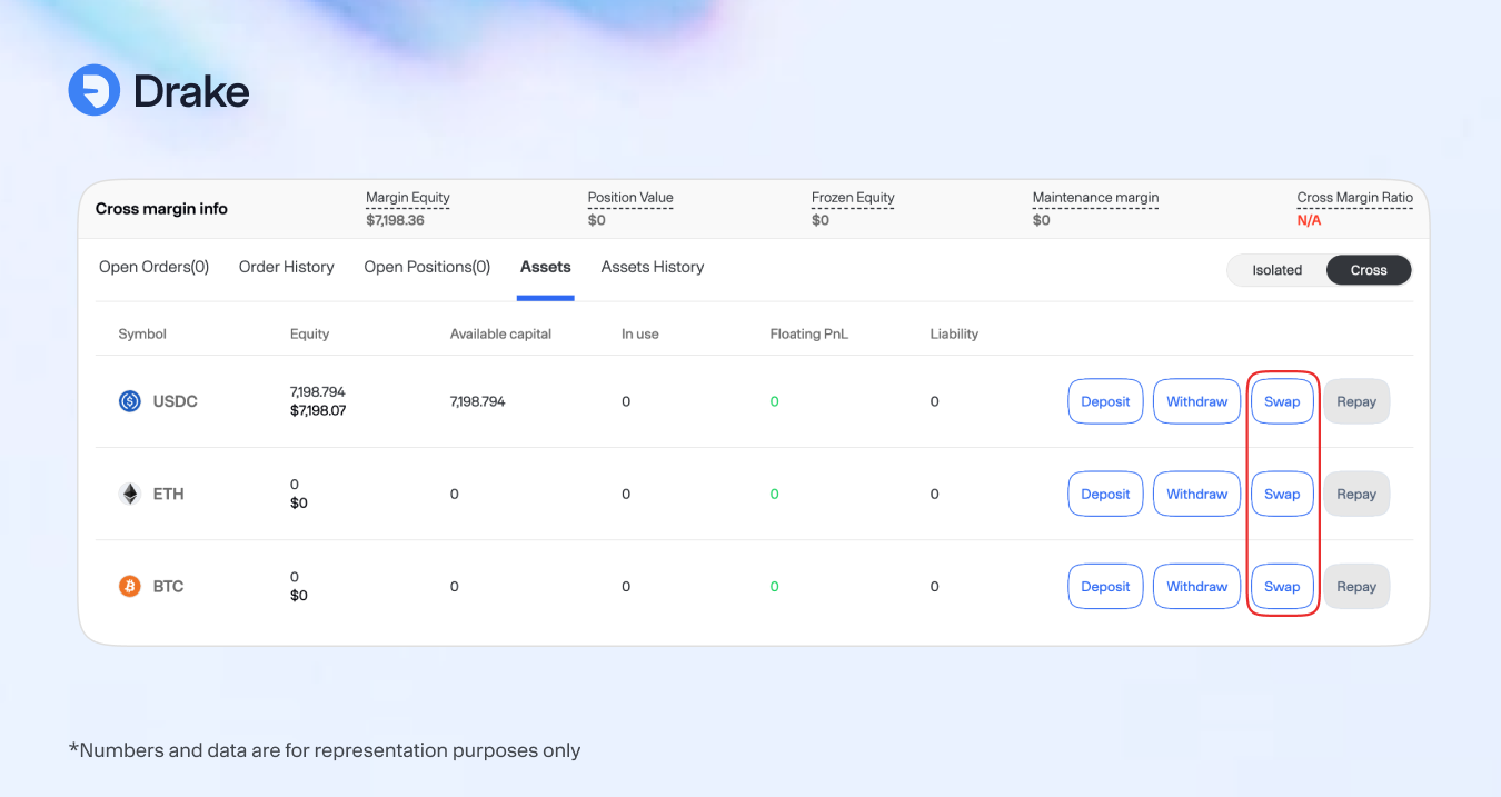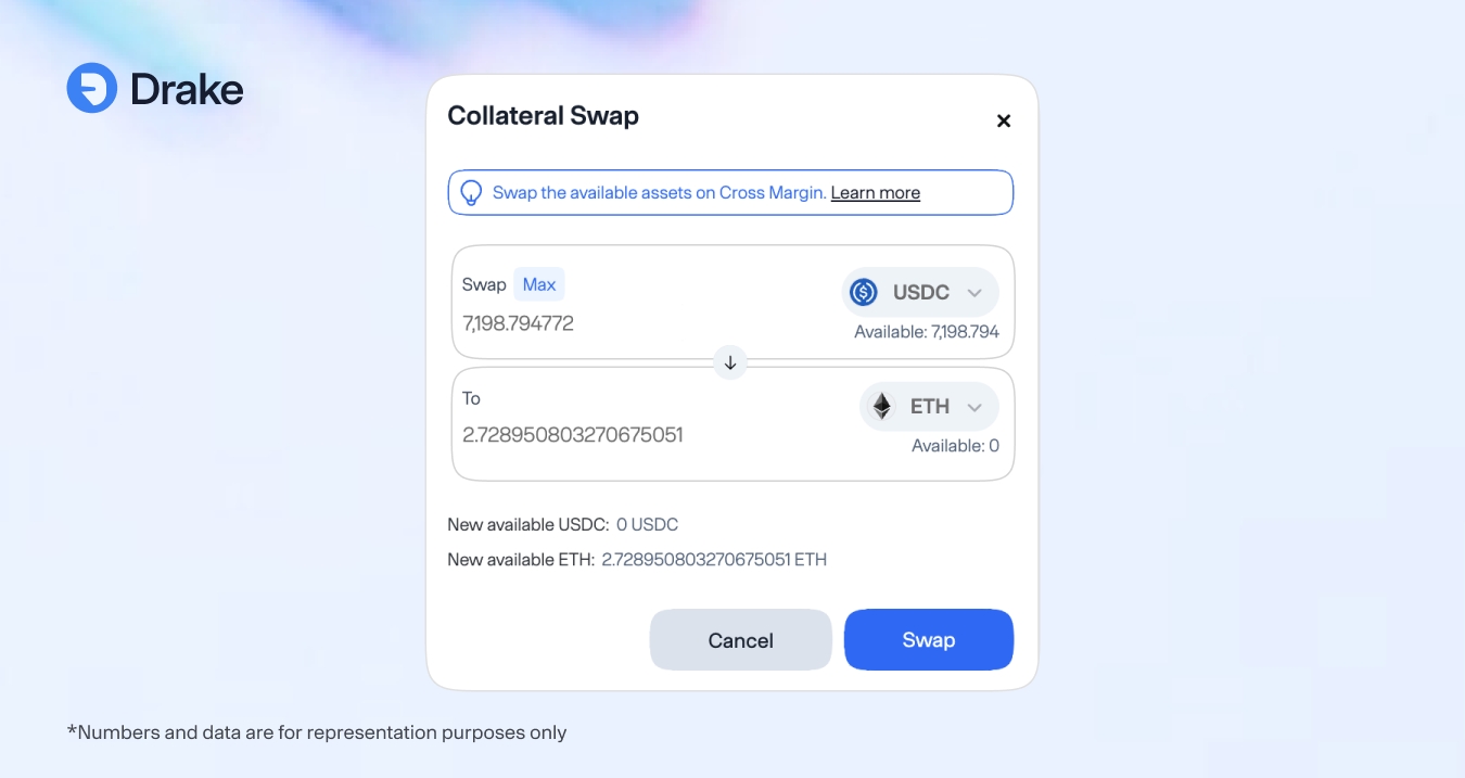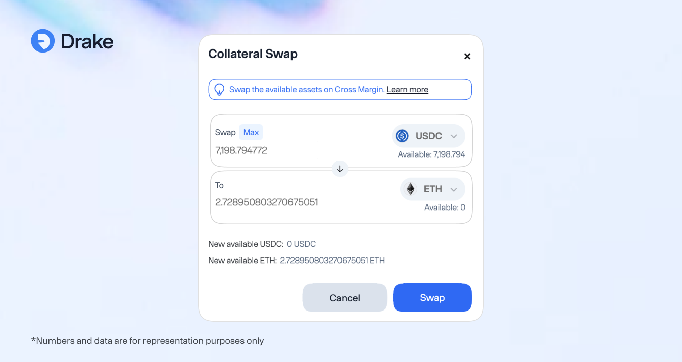 In cross-margin portfolios, Drake allows you to swap your available balance seamlessly. Currently, swap orders are routed through the Uniswap V3 and Aerodrome AMMs pool to ensure efficient execution. To protect your portfolio from the risk of liquidation, Drake enforces a safeguard that prevents any swap that would reduce your portfolio margin ratio below 200%. This ensures your positions remain secure while giving you the flexibility to manage your collateral.