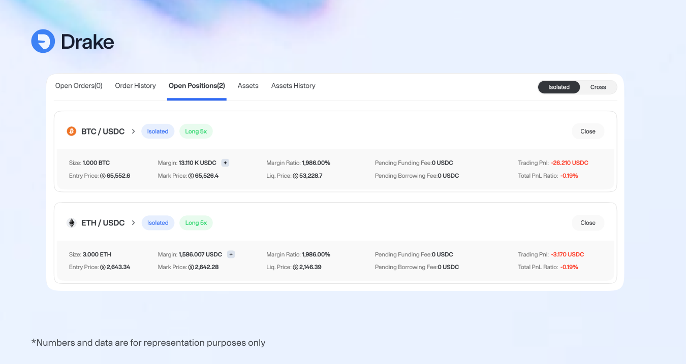 Example: With $10,000 total USDC, you open a long BTC position with $5,000 isolated margin and a short ETH position with $3,000 isolated margin, leaving $2,000 free. If the BTC position liquidates, you lose only the $5,000 allocated to it. The ETH position and remaining $2,000 stay intact, leaving you with $5,000 total.