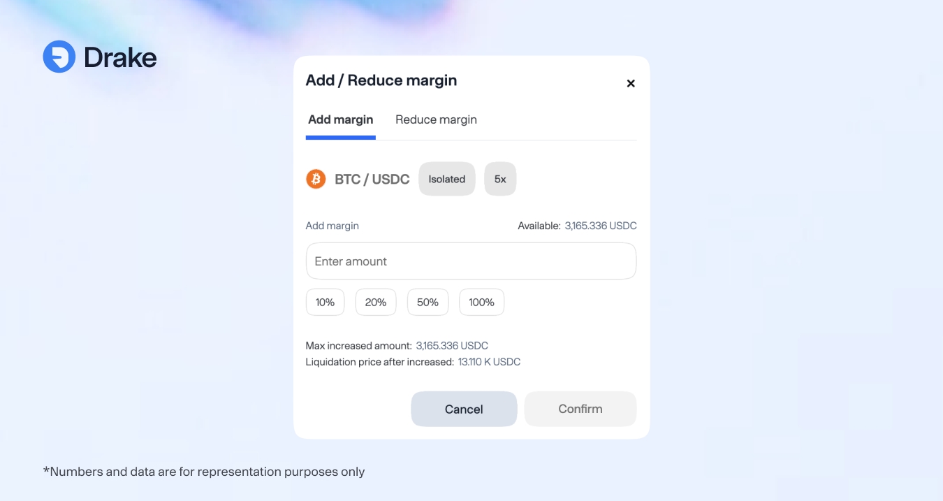 For isolated margin accounts, Drake currently supports using only the settlement currency as collateral. You can easily allocate additional margin to an open position, giving you the flexibility to manage your risk as needed. However, please be aware that a 1% fee applies when you initially allocate additional margin, as well as when you add or reduce margin afterward.
